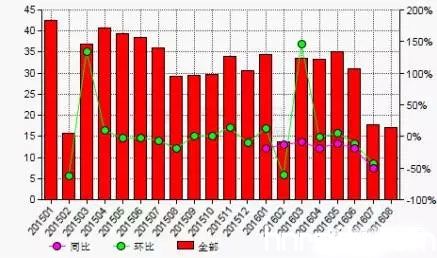 上圖顯示,2016年中國棕剛玉生產(chǎn)整體開工率較去年明顯下滑。隨著耐火材料淡季到來,6月份開全國平均開工率開始下滑,且7-8月份跳躍式下降。特別是7月份中國平均開工率大幅環(huán)比下滑11.49%,8月份繼續(xù)小幅下探。