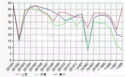 2016年河南、山西以及貴州地區(qū)棕剛玉原料塊廠家平均開工率變化曲線圖(%):